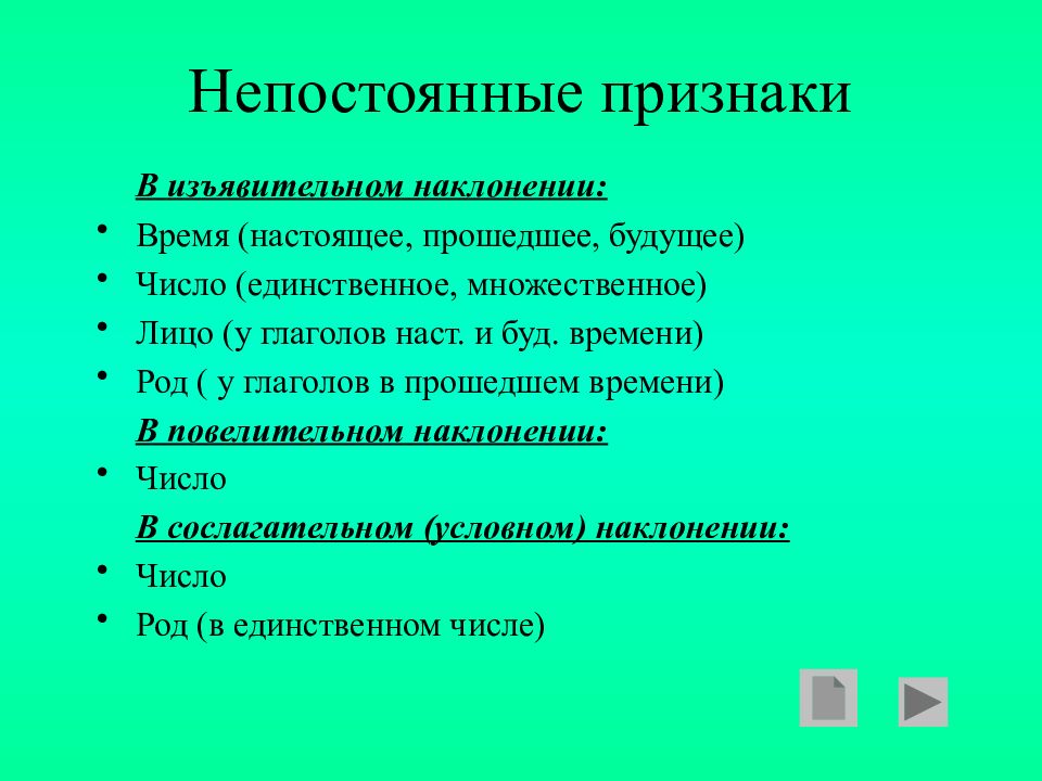В изъявительном наклонении: Время (настоящее, прошедшее, будущее) Число (единственное, множественное) Лицо (у глаголов наст. и буд. времени) Род ( у глаголов в прошедшем времени) В повелительном наклонении: Число В сослагательном (условном) наклонении: Число Род (в единственном числе)