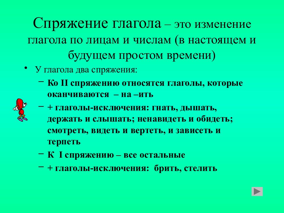 У глагола два спряжения: Ко II спряжению относятся глаголы, которые оканчиваются – на –ить + глаголы-исключения: гнать, дышать, держать и слышать; ненавидеть и обидеть; смотреть, видеть и вертеть, и зависеть и терпеть К I спряжению – все остальные + глаголы-исключения: брить, стелить
