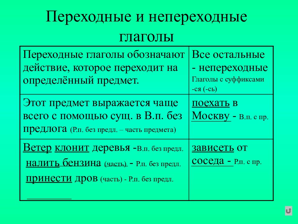 Переходные глаголы обозначают действие, которое переходит на определённый предмет. Все остальные - непереходные Глаголы с суффиксами -ся (-сь) Этот предмет выражается чаще всего с помощью сущ. в В.п. без предлога (Р.п. без предл. – часть предмета) поехать в Москву - В.п. с пр. Ветер клонит деревья - В.п. без предл. налить бензина (часть) - Р.п. без предл. принести дров (часть) - Р.п. без предл. зависеть от соседа - Р.п. с пр.