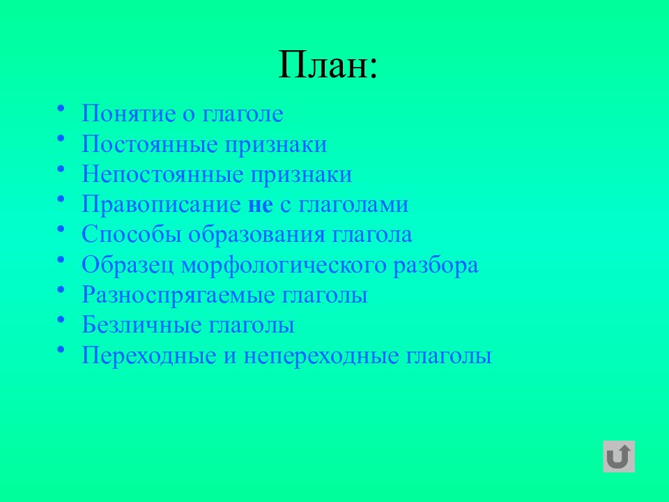 Понятие о глаголе Постоянные признаки Непостоянные признаки Правописание не с глаголами Способы образования глагола Образец морфологического разбора Разноспрягаемые глаголы Безличные глаголы Переходные и непереходные глаголы