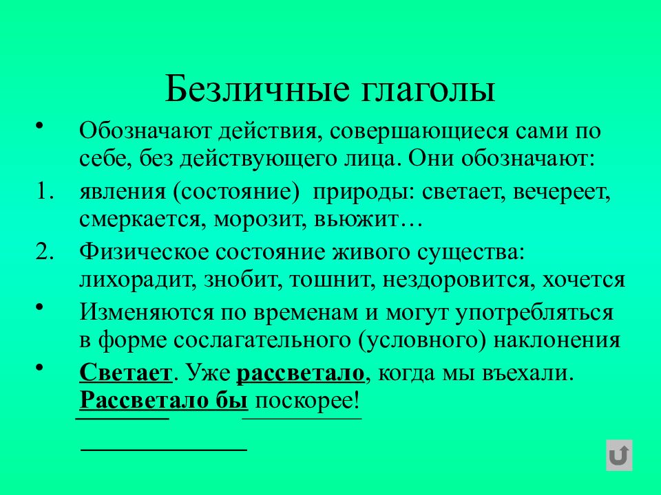 Обозначают действия, совершающиеся сами по себе, без действующего лица. Они обозначают: явления (состояние) природы: светает, вечереет, смеркается, морозит, вьюжит… Физическое состояние живого существа: лихорадит, знобит, тошнит, нездоровится, хочется Изменяются по временам и могут употребляться в форме сослагательного (условного) наклонения Светает. Уже рассветало, когда мы въехали. Рассветало бы поскорее!