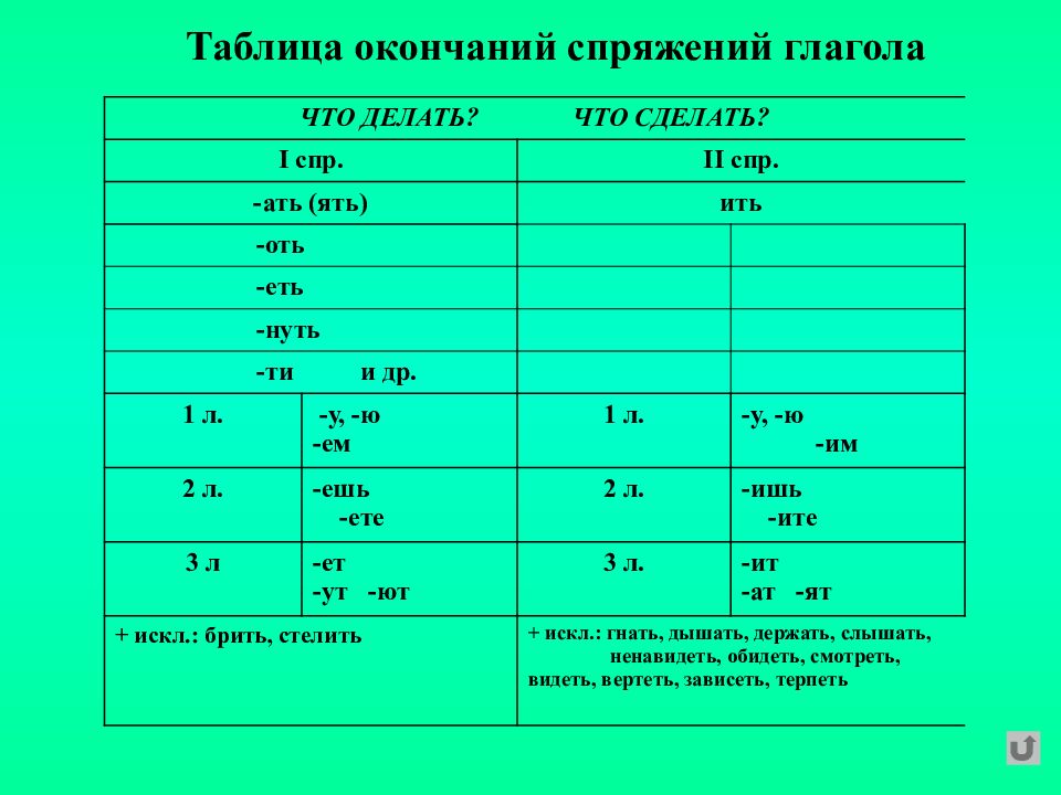 ЧТО ДЕЛАТЬ? ЧТО СДЕЛАТЬ? I спр. II спр. - ать (ять) ить - оть - еть - нуть - ти и др. 1 л. -у, -ю -ем 1 л. -у, -ю - им 2 л. - ешь - ете 2 л. - ишь - ите 3 л - ет - ут - ют 3 л. - ит - ат - ят + искл.: брить, стелить + искл.: гнать, дышать, держать, слышать, ненавидеть, обидеть, смотреть, видеть, вертеть, зависеть, терпеть Таблица окончаний спряжений глагола