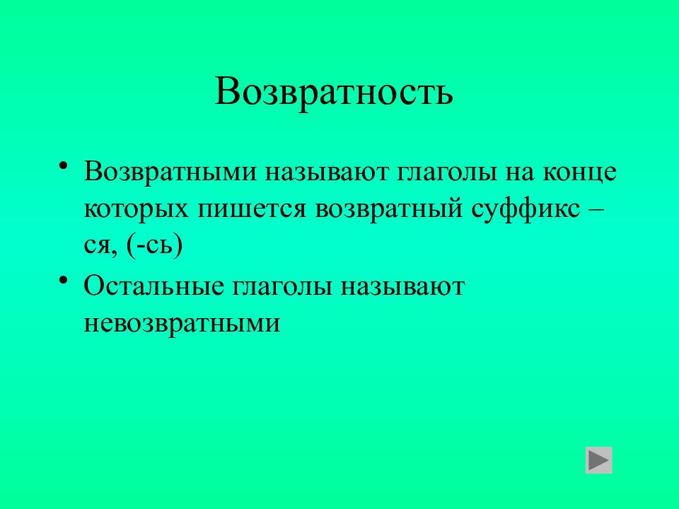 Возвратными называют глаголы на конце которых пишется возвратный суффикс –ся, (-сь) Остальные глаголы называют невозвратными