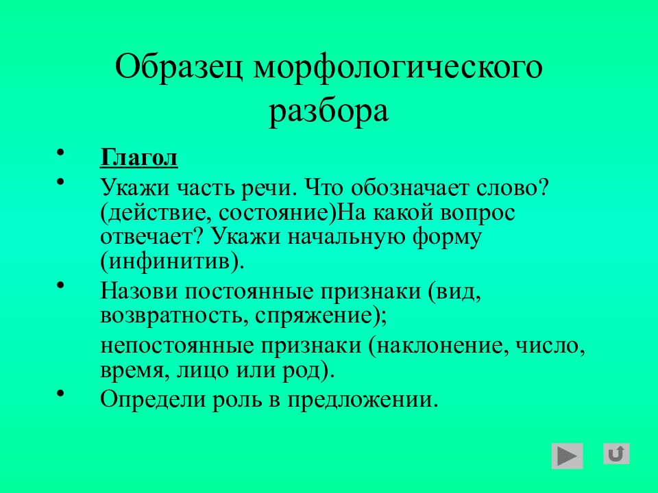 Глагол Укажи часть речи. Что обозначает слово? (действие, состояние)На какой вопрос отвечает? Укажи начальную форму (инфинитив). Назови постоянные признаки (вид, возвратность, спряжение); непостоянные признаки (наклонение, число, время, лицо или род). Определи роль в предложении.