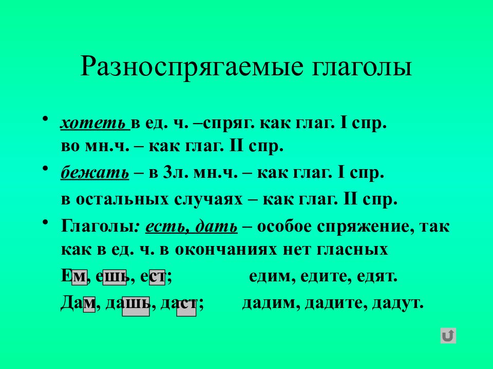 хотеть в ед. ч. –спряг. как глаг. I спр. во мн.ч. – как глаг. II спр. бежать – в 3л. мн.ч. – как глаг. I спр. в остальных случаях – как глаг. II спр. Глаголы : есть, дать – особое спряжение, так как в ед. ч. в окончаниях нет гласных Ем, ешь, ест; едим, едите, едят. Дам, дашь, даст; дадим, дадите, дадут.