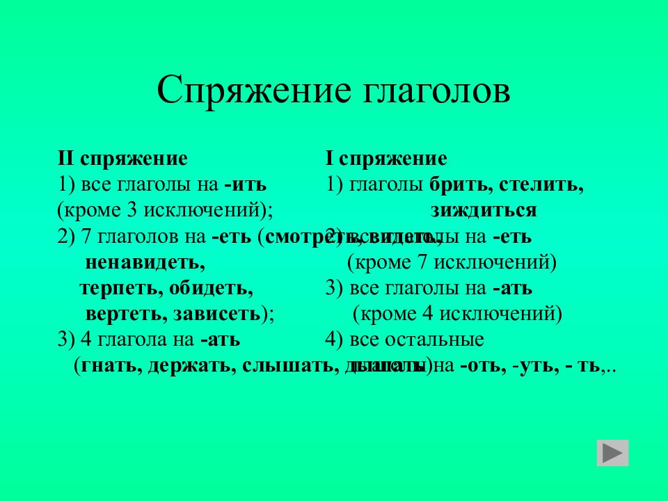 II спряжение 1) все глаголы на -ить (кроме 3 исключений); 2) 7 глаголов на -еть ( смотреть, видеть, ненавидеть, терпеть, обидеть, вертеть, зависеть ); 3) 4 глагола на -ать ( гнать, держать, слышать, дышать ). I спряжение 1) глаголы брить, стелить, зиждиться 2) все глаголы на -еть (кроме 7 исключений) 3) все глаголы на -ать (кроме 4 исключений) 4) все остальные глаголы на -оть, - уть, - ть,..