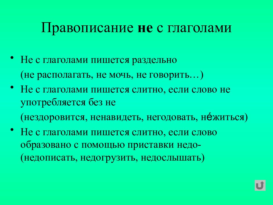 Не с глаголами пишется раздельно (не располагать, не мочь, не говорить…) Не с глаголами пишется слитно, если слово не употребляется без не (нездоровится, ненавидеть, негодовать, н é житься) Не с глаголами пишется слитно, если слово образовано с помощью приставки недо- (недописать, недогрузить, недослышать)