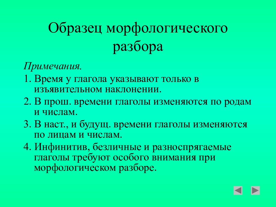 Примечания. 1. Время у глагола указывают только в изъявительном наклонении. 2. В прош. времени глаголы изменяются по родам и числам. 3. В наст., и будущ. времени глаголы изменяются по лицам и числам. 4. Инфинитив, безличные и разноспрягаемые глаголы требуют особого внимания при морфологическом разборе.