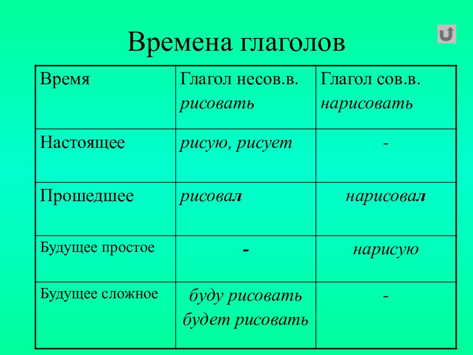 Время Глагол несов.в. рисовать Глагол сов.в. нарисовать Настоящее рисую, рисует - Прошедшее рисова л нарисова л Будущее простое - нарисую Будущее сложное буду рисовать будет рисовать -