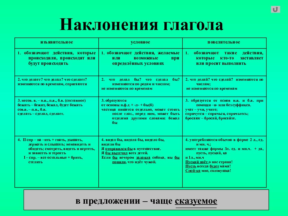 изъявительное условное повелительное 1. обозначают действия, которые происходили, происходят или будут происходить 1. обозначают действия, желаемые или возможные при определённых условиях 1. обозначают такие действия, которые кто-то заставляет или просит выполнить 2. что делает? что делал? что сделает? изменяются по временам, спрягаются 2. что делал бы? что сделал бы? изменяются по родам и числам; не изменяются по временам 2. что делай? что сделай? изменяются по числам; не изменяются по временам 3. несов. в. – н.в., п.в., б.в. (составное) бежать – бежит, бежал, будет бежать сов.в. – п.в., б.в. сделать – сделал, сделает. 3. образуются от основы н.ф.г. + -л- + бы(б) частица пишется отдельно, может стоять после глаг., перед ним, может быть отделена другими словами: бежал бы 3. образуется от основ н.в. и б.в. при помощи –и- или без суффикса. учат – учи, учите; спрячутся – спрячься, спрячьтесь; бросают – бросай, бросайте. 4. II спр – на –ить + гнать, дышать, держать и слышать; ненавидеть и обидеть; смотреть, видеть и вертеть, и зависеть и терпеть I – спр. – все остальные + брить, стелить 4. видел бы, видела бы, видело бы, видели бы Я отправился бы в путешествие. Я бы вылечил всех детей. Если бы вечером залаяла собака, вы бы поняли, что идёт чужой. 4. употребляются обычно в форме 2 л., ед. и мн. ч.; имеет также формы 3л. ед. и мн.ч. + да, пусть, пускай, ка и 1л., мн.ч Пускай поёт о нас страна! Пусть всегда будет мама! Спой-ка мне, соловушка! в предложении – чаще сказуемое
