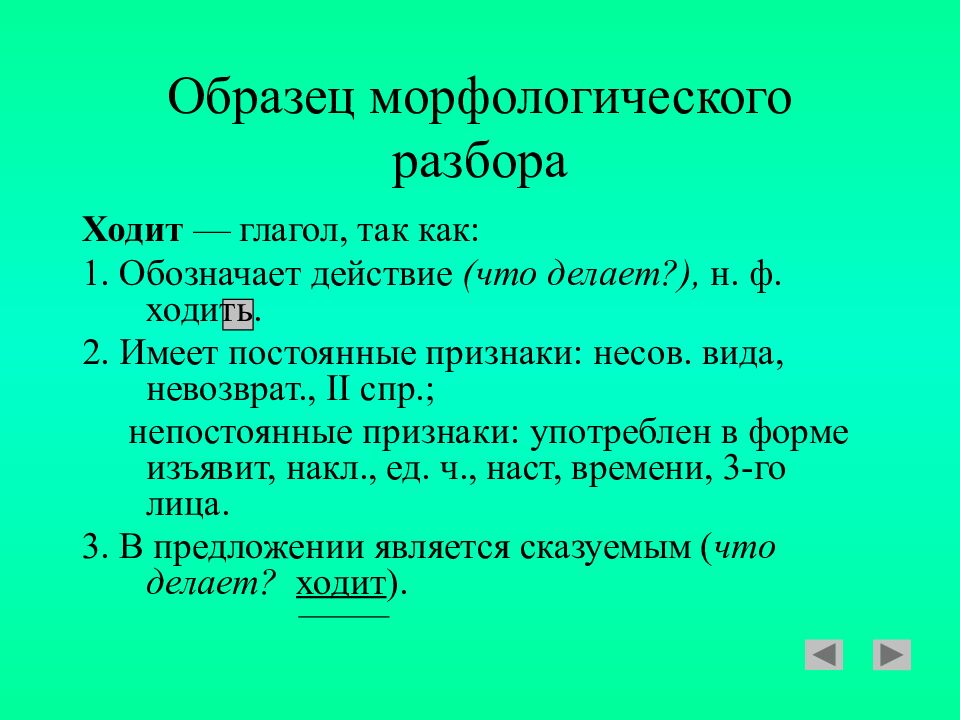 Ходит — глагол, так как: 1. Обозначает действие (что делает?), н. ф. ходить. 2. Имеет постоянные признаки: несов. вида, невозврат., II спр.; непостоянные признаки: употреблен в форме изъявит, накл., ед. ч., наст, времени, 3-го лица. 3. В предложении является сказуемым ( что делает? ходит ).