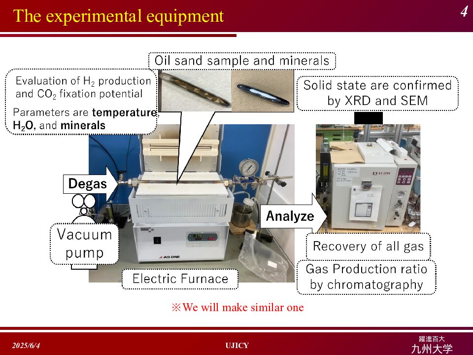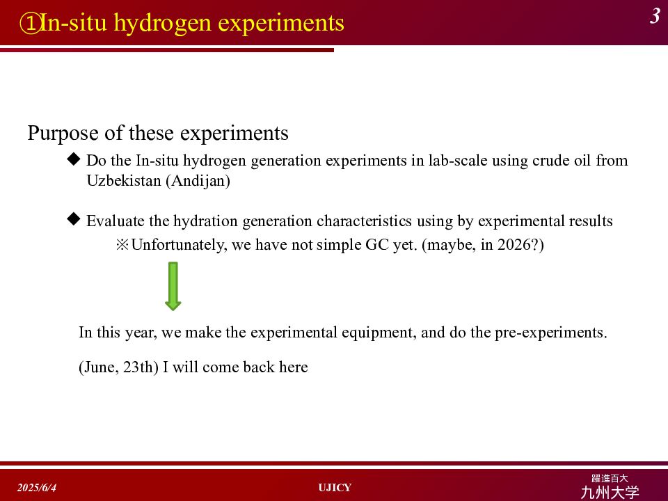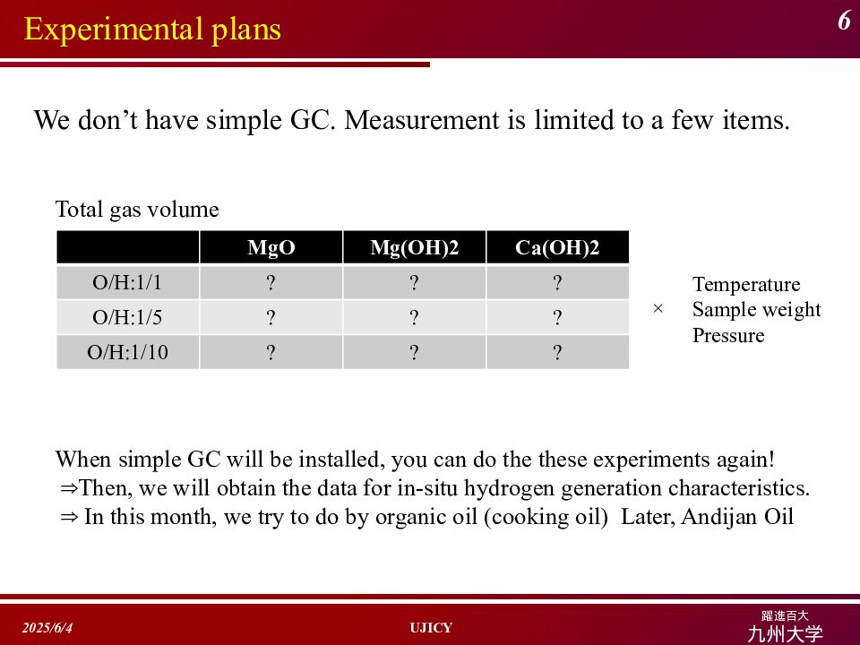 2025/6/4 UJICY Experimental plans We don’t have simple GC. Measurement is limited to a few items. Total gas volume MgO Mg(OH)2 Ca(OH)2 O/H:1/1 ? ? ? O/H:1/5 ? ? ? O/H:1/10 ? ? ? × Temperature Sample weight Pressure When simple GC will be installed, you can do the these experiments again! ⇒ Then, we will obtain the data for in-situ hydrogen generation characteristics. ⇒ In this month, we try to do by organic oil (cooking oil) Later, Andijan Oil