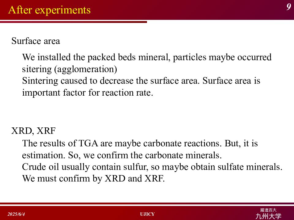 2025/6/4 UJICY After experiments Surface area We installed the packed beds mineral, particles maybe occurred sitering (agglomeration) Sintering caused to decrease the surface area. Surface area is important factor for reaction rate. XRD, XRF The results of TGA are maybe carbonate reactions. But, it is estimation. So, we confirm the carbonate minerals. Crude oil usually contain sulfur, so maybe obtain sulfate minerals. We must confirm by XRD and XRF.