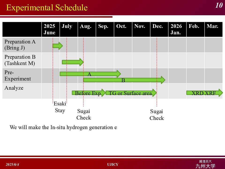 2025/6/4 UJICY Experimental Schedule 2025 June July Aug. Sep. Oct. Nov. Dec. 2026 Jan. Feb. Mar. Preparation A (Bring J) Preparation B (Tashkent M) Pre-Experiment Analyze A B Before Exp TG or Surface area XRD XRF Esaki Stay Sugai Check Sugai Check We will make the In-situ hydrogen generation e