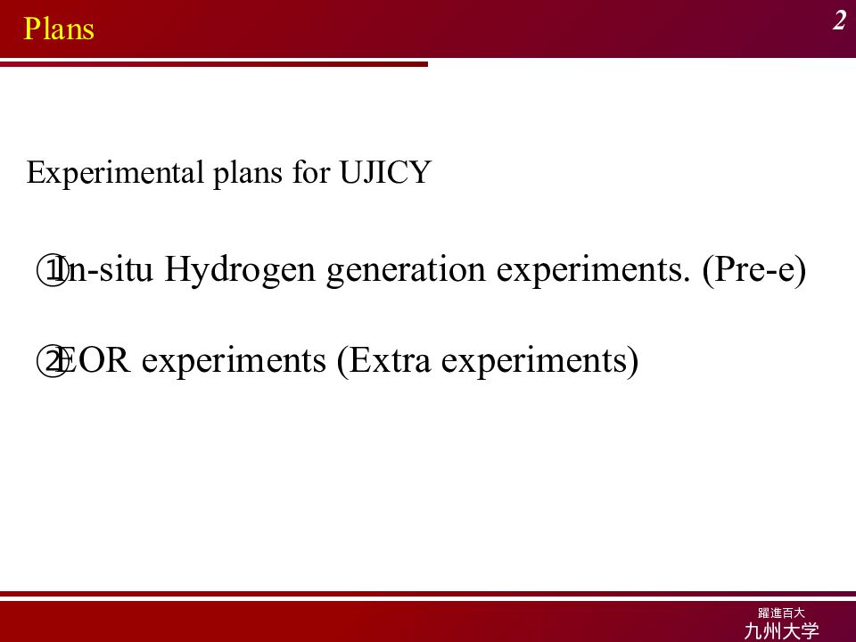 Plans Experimental plans for UJICY ① In-situ Hydrogen generation experiments. (Pre-e) ② EOR experiments (Extra experiments)