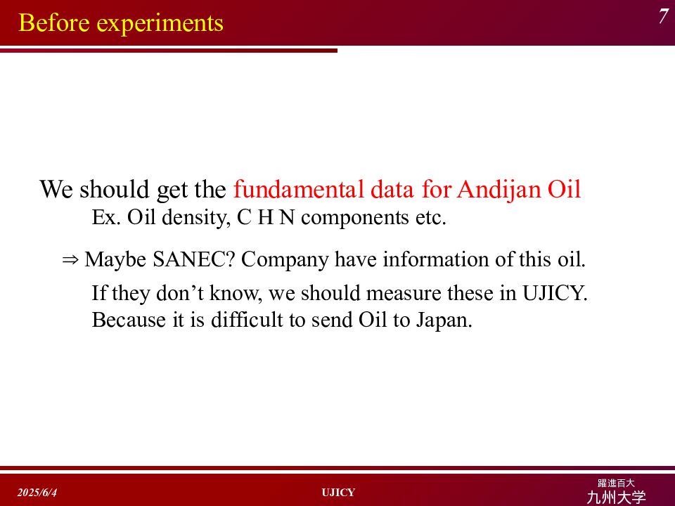 2025/6/4 UJICY Before experiments We should get the fundamental data for Andijan Oil Ex. Oil density, C H N components etc. ⇒ Maybe SANEC? Company have information of this oil. If they don’t know, we should measure these in UJICY. Because it is difficult to send Oil to Japan.