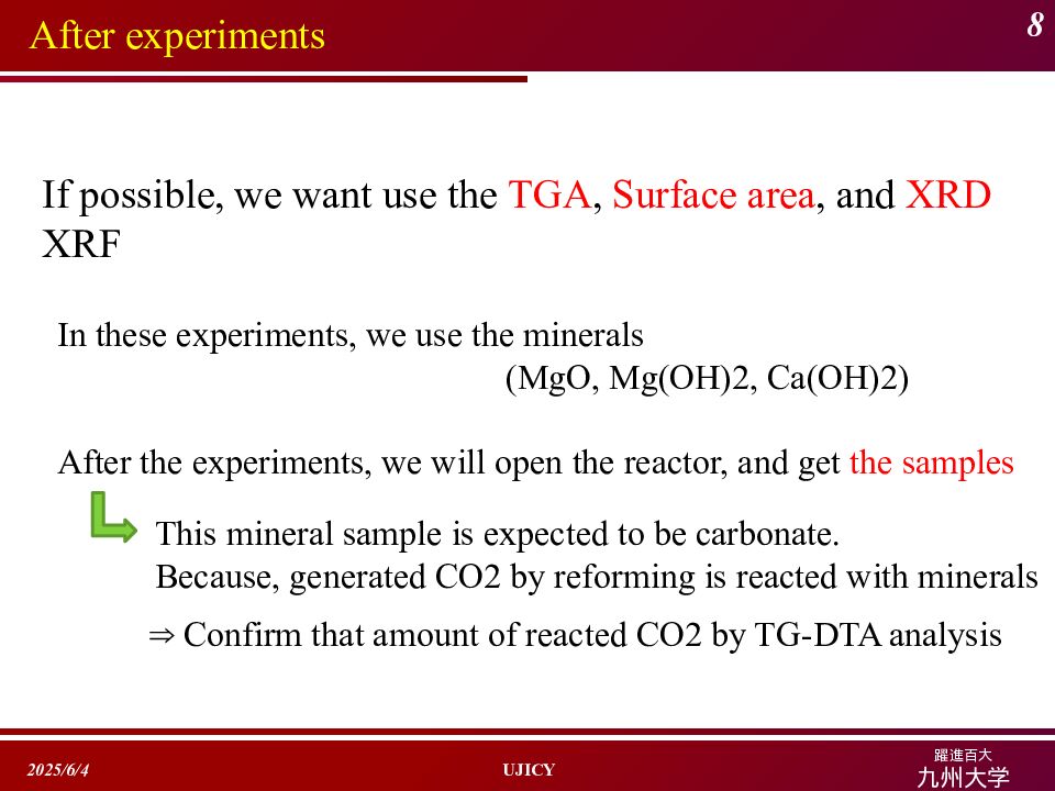 2025/6/4 UJICY After experiments If possible, we want use the TGA, Surface area, and XRD XRF In these experiments, we use the minerals (MgO, Mg(OH)2, Ca(OH)2) After the experiments, we will open the reactor, and get the samples This mineral sample is expected to be carbonate. Because, generated CO2 by reforming is reacted with minerals ⇒ Confirm that amount of reacted CO2 by TG-DTA analysis