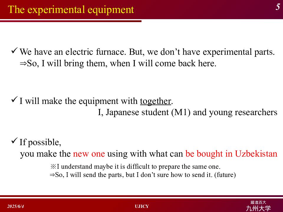 2025/6/4 UJICY The experimental equipment We have an electric furnace. But, we don’t have experimental parts. ⇒ So, I will bring them, when I will come back here. I will make the equipment with together. I, Japanese student (M1) and young researchers If possible, you make the new one using with what can be bought in Uzbekistan ※I understand maybe it is difficult to prepare the same one. ⇒ So, I will send the parts, but I don’t sure how to send it. (future)