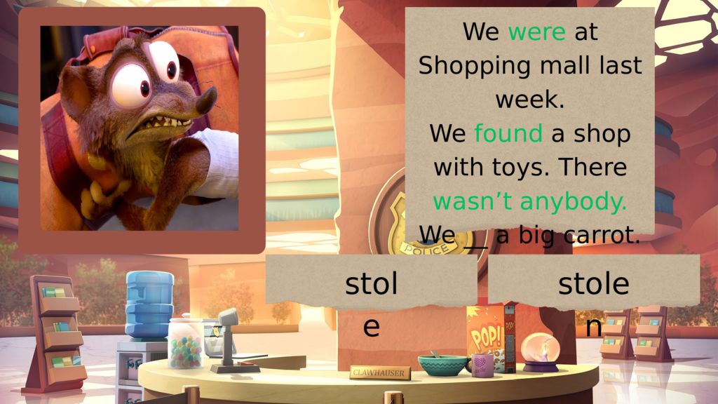 We were at Shopping mall last week. We found a shop with toys. There wasn’t anybody. We __ a big carrot. stole stolen