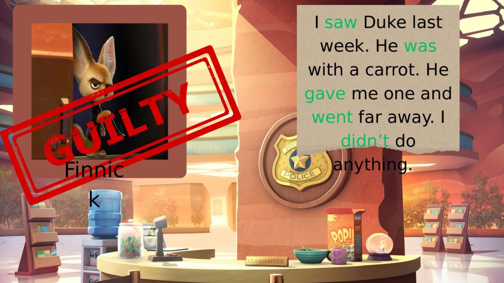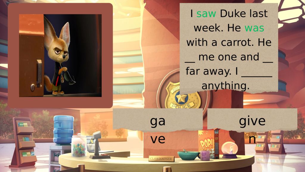 I __ Duke last week. He __ with carrot. He __ me one and __ far away. I ______ anything. saw seen Finnick