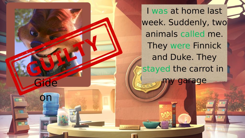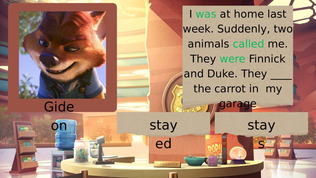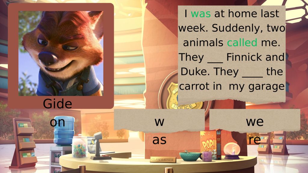 I __ at home last week. Suddenly, two animals _____ me. They ___ Finnick and Duke. They ____ the carrot in my garage was were Gideon