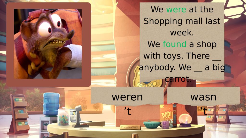 We were at the Shopping mall last week. We found a shop with toys. There __ anybody. We __ a big carrot. weren’t wasn’t