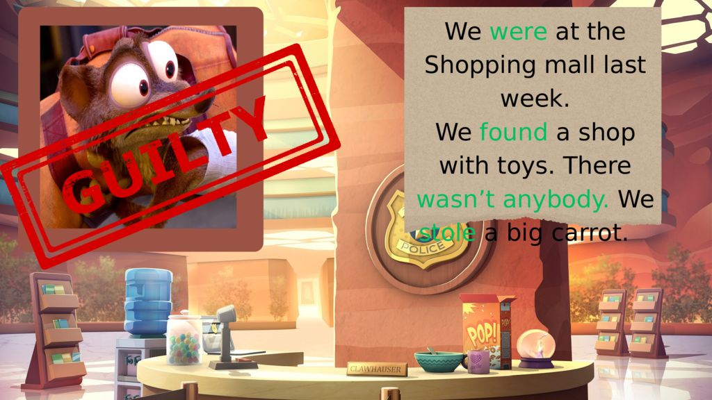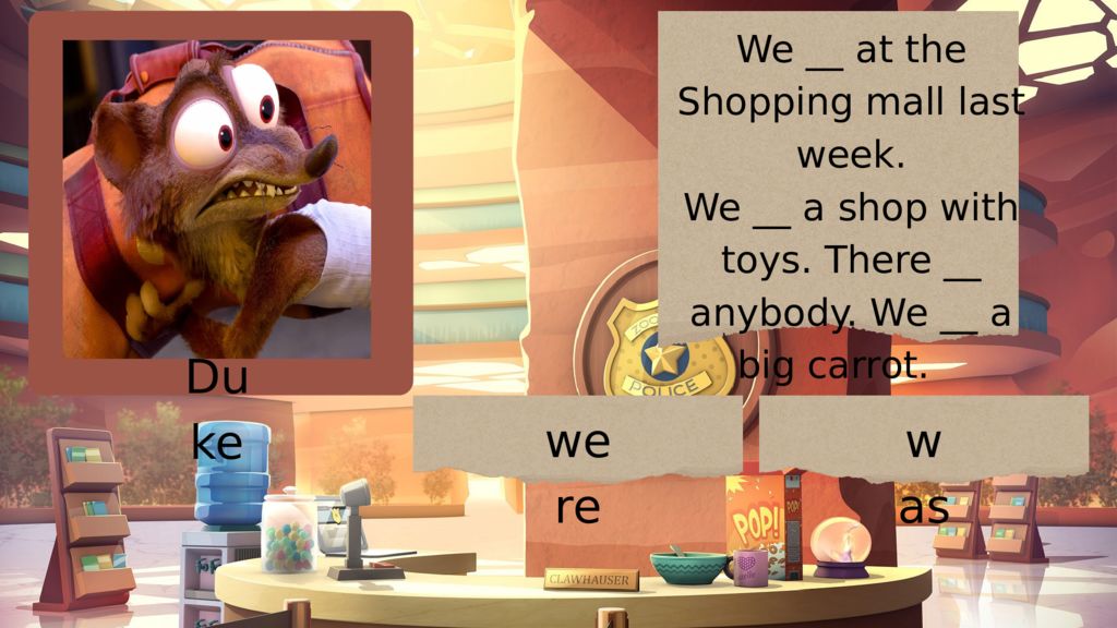 We __ at the Shopping mall last week. We __ a shop with toys. There __ anybody. We __ a big carrot. were was Duke
