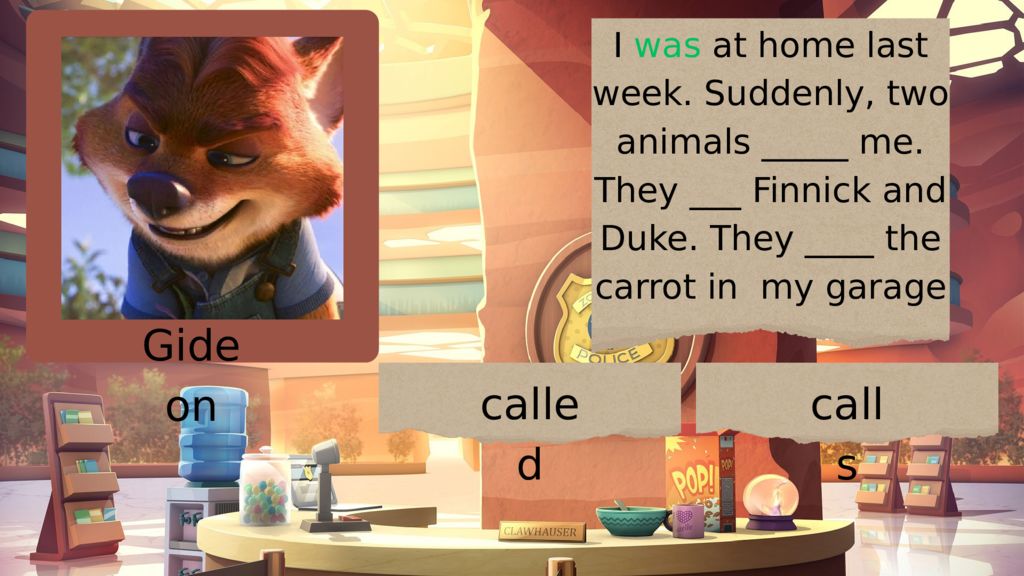 I was at home last week. Suddenly, two animals called me. They ___ Finnick and Duke. They ____ the carrot in my garage was were Gideon