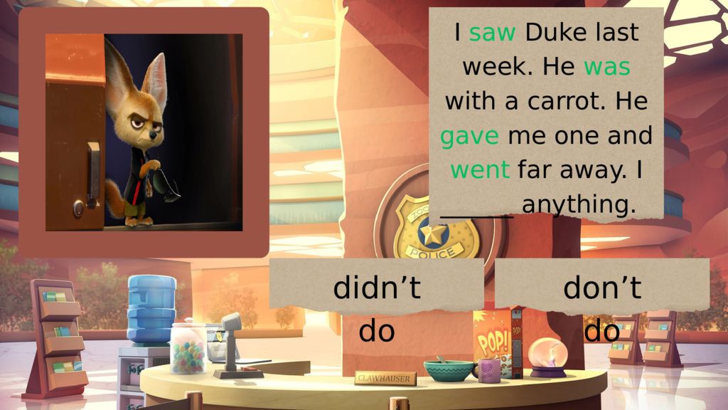 I saw Duke last week. He was with a carrot. He gave me one and went far away. I ______ anything. didn’t do don’t do
