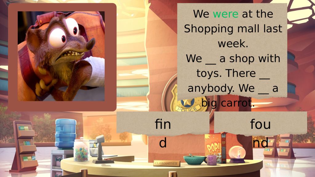 We were at the Shopping mall last week. We __ a shop with toys. There __ anybody. We __ a big carrot. find found