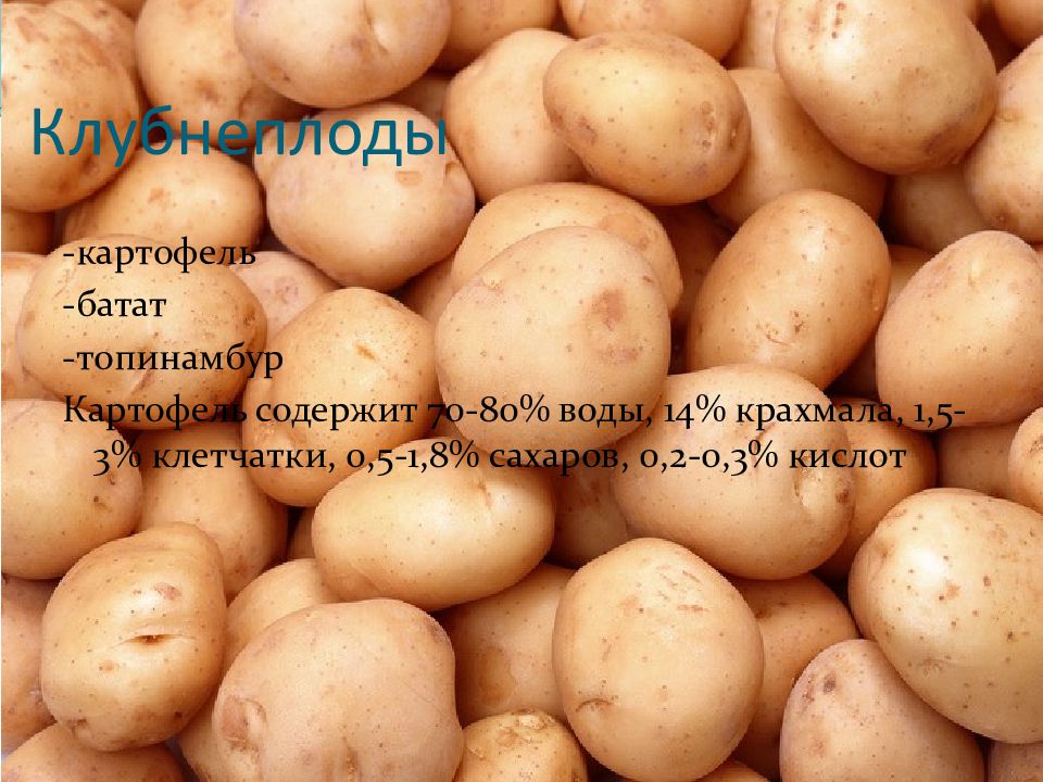 -картофель -батат -топинамбур Картофель содержит 70-80% воды, 14% крахмала, 1,5-3% клетчатки, 0,5-1,8% сахаров, 0,2-0,3% кислот