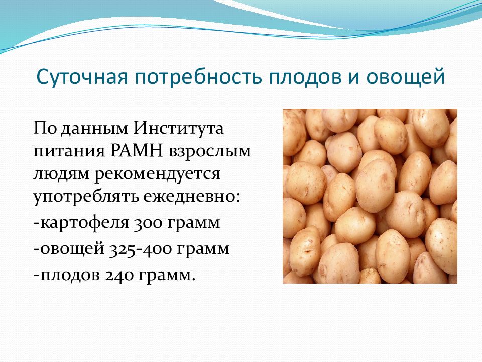 По данным Института питания РАМН взрослым людям рекомендуется употреблять ежедневно: -картофеля 300 грамм -овощей 325-400 грамм -плодов 240 грамм.