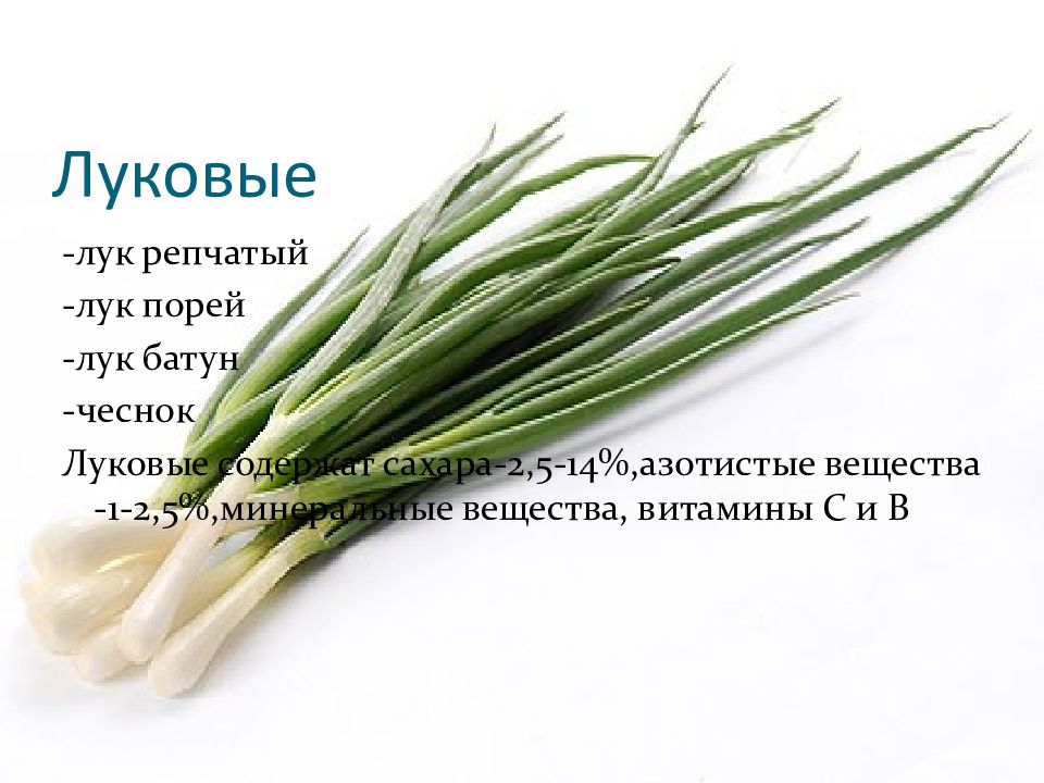 -лук репчатый -лук порей -лук батун -чеснок Луковые содержат сахара-2,5-14%,азотистые вещества -1-2,5%,минеральные вещества, витамины С и В