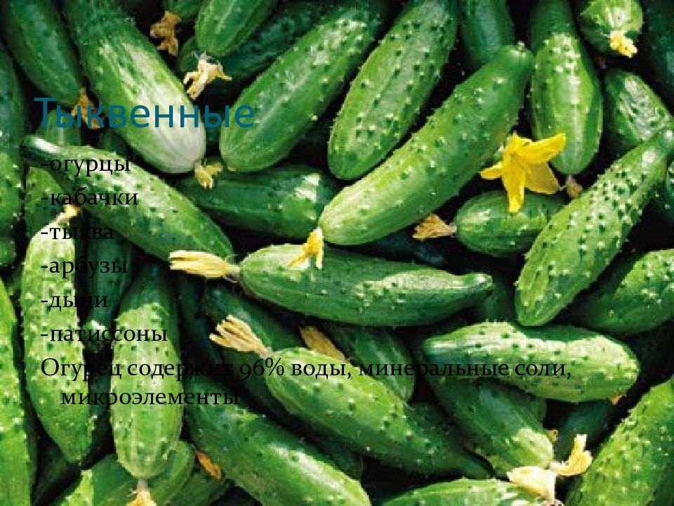 -огурцы -кабачки -тыква -арбузы -дыни -патиссоны Огурец содержит 96% воды, минеральные соли, микроэлементы