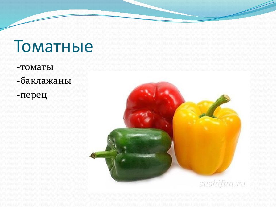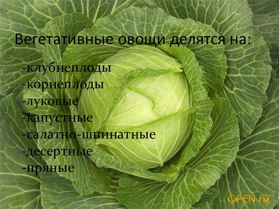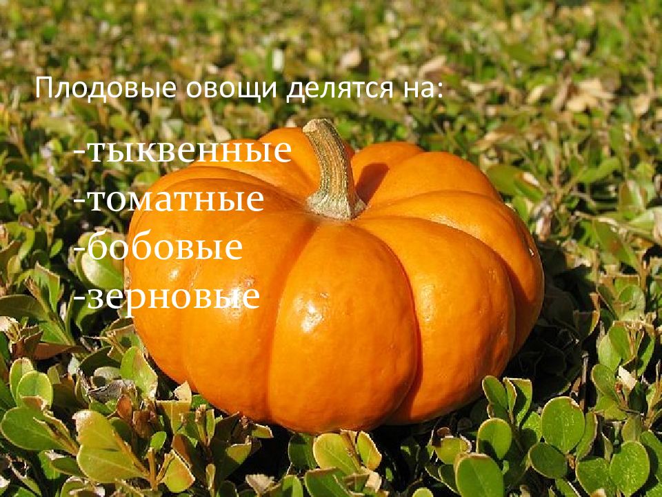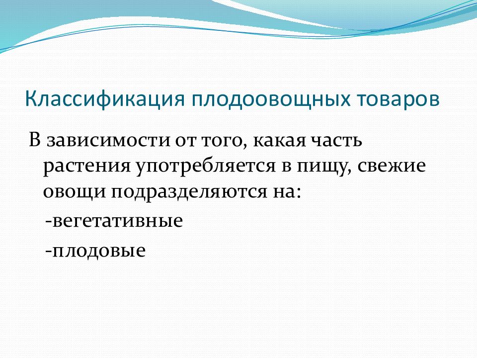 В зависимости от того, какая часть растения употребляется в пищу, свежие овощи подразделяются на: -вегетативные -плодовые