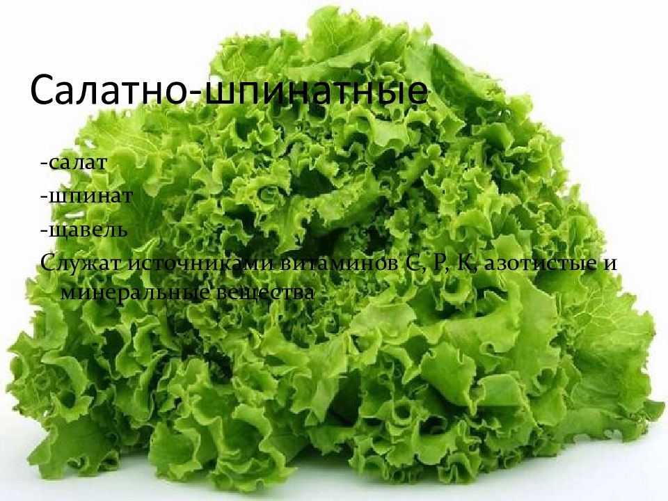 -салат -шпинат -щавель Служат источниками витаминов С, Р, К, азотистые и минеральные вещества