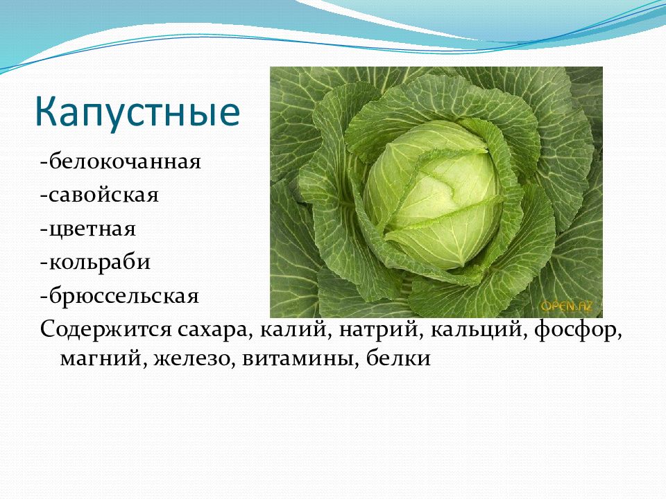 -белокочанная -савойская -цветная -кольраби -брюссельская Содержится сахара, калий, натрий, кальций, фосфор, магний, железо, витамины, белки