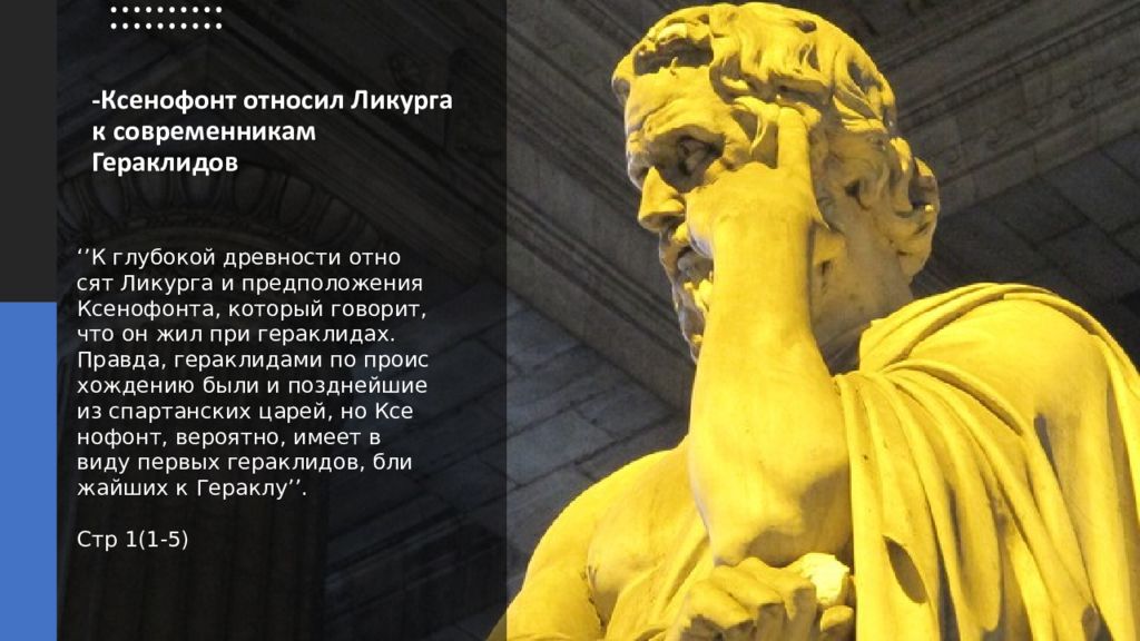 -Ксенофонт относил Ликурга к современникам Гераклидов ‘’ К глубокой древности относят Ликурга и предположения Ксенофонта, который говорит, что он жил при гераклидах. Правда, гераклидами по происхождению были и позднейшие из спартанских царей, но Ксенофонт, вероятно, имеет в виду первых гераклидов, ближайших к Гераклу ’’. Стр 1 (1-5)