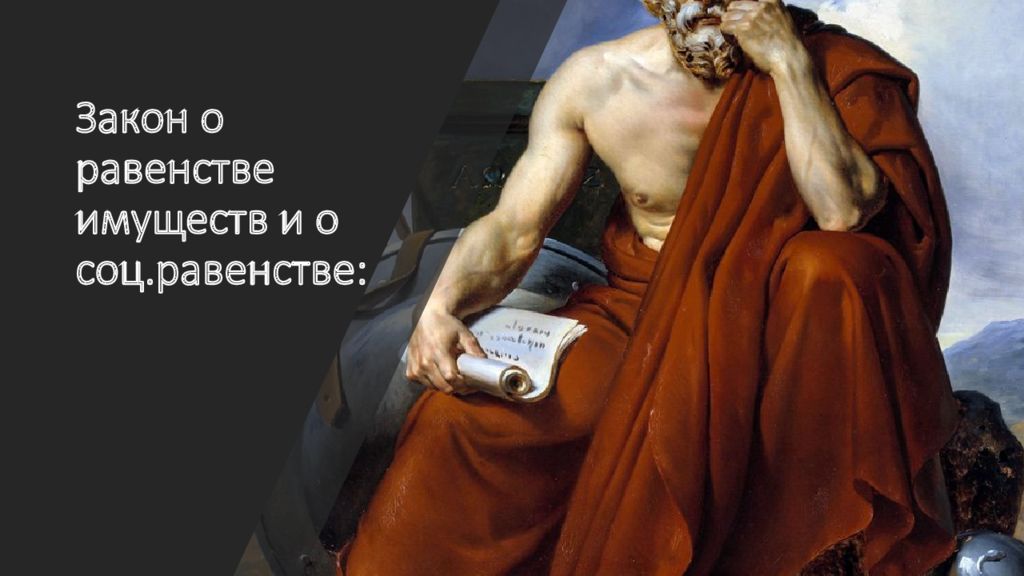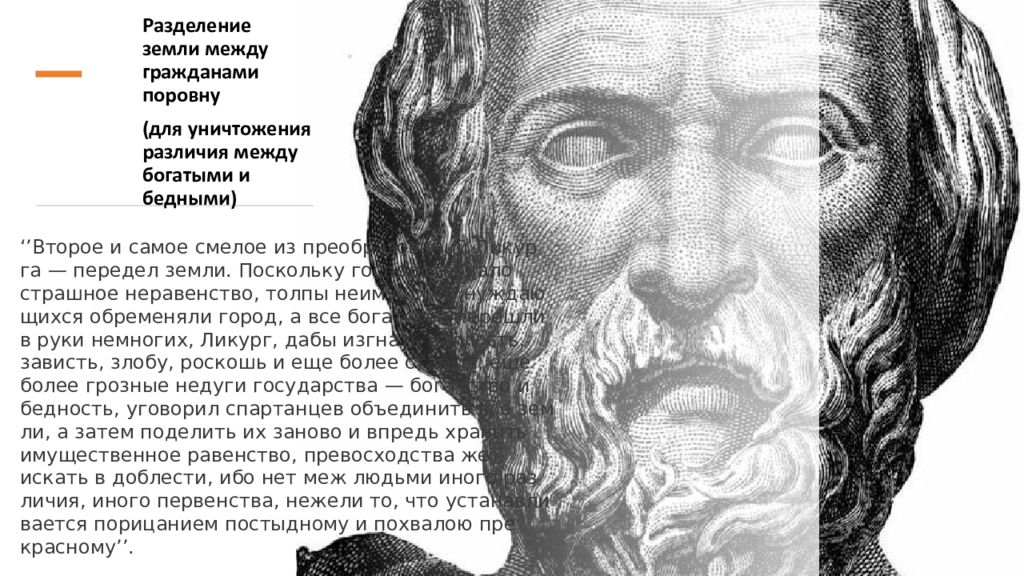 Разделение земли между гражданами поровну ( для уничтожения различия между богатыми и бедными ) ‘’ Второе и самое смелое из преобразований Ликурга — передел земли. Поскольку господствовало страшное неравенство, толпы неимущих и нуждающихся обременяли город, а все богатства перешли в руки немногих, Ликург, дабы изгнать наглость, зависть, злобу, роскошь и еще более старые, еще более грозные недуги государства — богатство и бедность, уговорил спартанцев объединить все земли, а затем поделить их заново и впредь хранить имущественное равенство, превосходства же искать в доблести, ибо нет меж людьми иного различия, иного первенства, нежели то, что устанавливается порицанием постыдному и похвалою прекрасному ’’. Стр 8 (8-9)