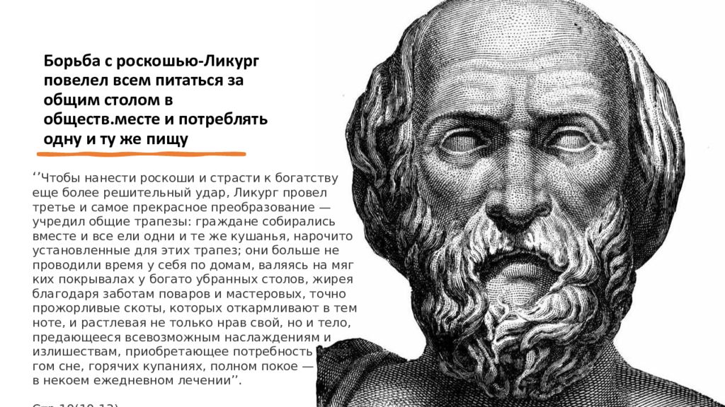Борьба с роскошью-Ликург повелел всем питаться за общим столом в обществ. месте и потреблять одну и ту же пищу ‘’ Чтобы нанести роскоши и страсти к богатству еще более решительный удар, Ликург провел третье и самое прекрасное преобразование — учредил общие трапезы: граждане собирались вместе и все ели одни и те же кушанья, нарочито установленные для этих трапез; они больше не проводили время у себя по домам, валяясь на мягких покрывалах у богато убранных столов, жирея благодаря заботам поваров и мастеровых, точно прожорливые скоты, которых откармливают в темноте, и растлевая не только нрав свой, но и тело, предающееся всевозможным наслаждениям и излишествам, приобретающее потребность в долгом сне, горячих купаниях, полном покое — словно в некоем ежедневном лечении ’’. Стр 10 (10-13)