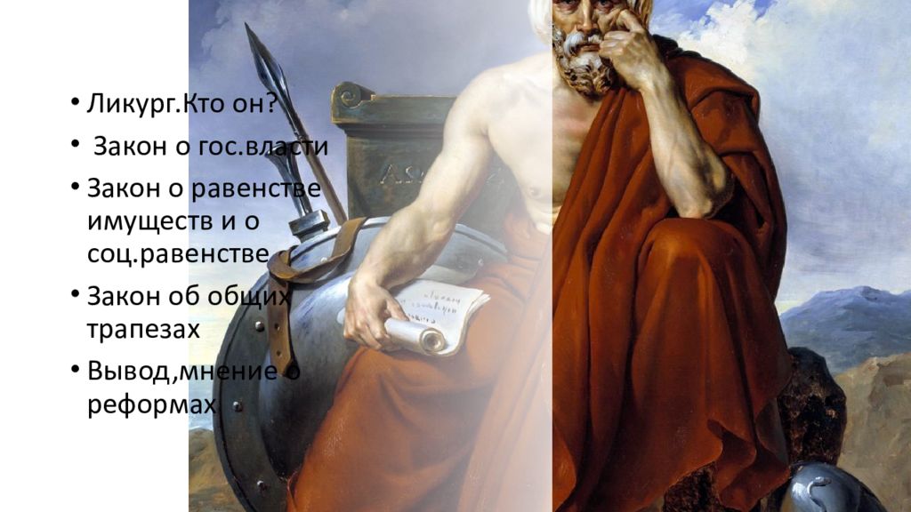 Ликург. Кто он ? Закон о гос. власти Закон о равенстве имуществ и о соц. равенстве Закон об общих трапезах Вывод, мнение о реформах