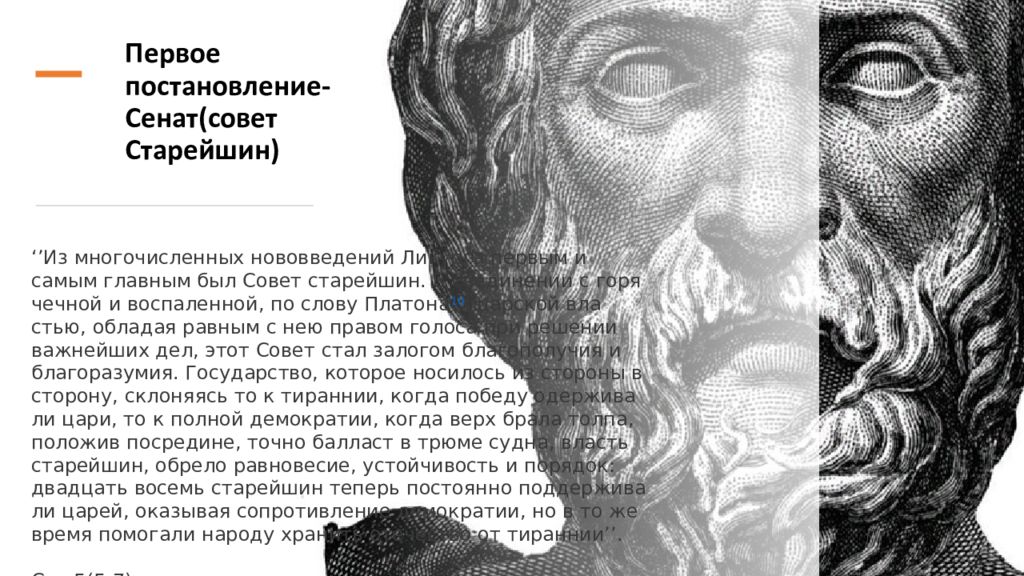 Первое постановление-Сенат (c овет Старейшин ) ‘’ Из многочисленных нововведений Ликурга первым и самым главным был Совет старейшин. В соединении с горячечной и воспаленной, по слову Платона 10, царской властью, обладая равным с нею правом голоса при решении важнейших дел, этот Совет стал залогом благополучия и благоразумия. Государство, которое носилось из стороны в сторону, склоняясь то к тираннии, когда победу одерживали цари, то к полной демократии, когда верх брала толпа, положив посредине, точно балласт в трюме судна, власть старейшин, обрело равновесие, устойчивость и порядок: двадцать восемь старейшин теперь постоянно поддерживали царей, оказывая сопротивление демократии, но в то же время помогали народу хранить отечество от тираннии ’’. Стр 5 (5-7)