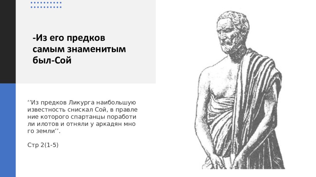 -Из его предков самым знаменитым был-Сой ‘’ Из предков Ликурга наибольшую известность снискал Сой, в правление которого спартанцы поработили илотов и отняли у аркадян много земли ’’. Стр 2 (1-5)
