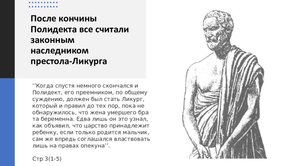 После кончины Полидекта все считали законным наследником престола-Ликурга ‘’ Когда спустя немного скончался и Полидект, его преемником, по общему суждению, должен был стать Ликург, который и правил до тех пор, пока не обнаружилось, что жена умершего брата беременна. Едва лишь он это узнал, как объявил, что царство принадлежит ребенку, если только родится мальчик, сам же впредь соглашался властвовать лишь на правах опекуна ’’. Стр 3 (1-5)