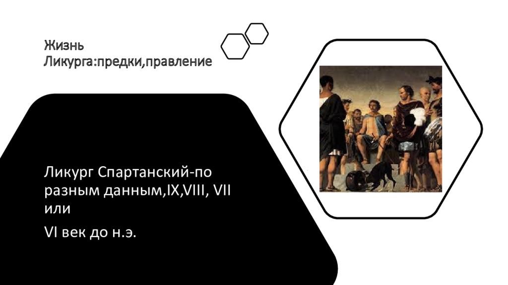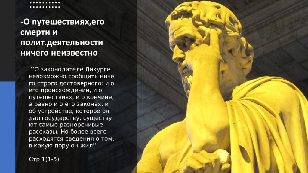 -О путешествиях, его смерти и полит. деятельности ничего неизвестно ’’ О законодателе Ликурге невозможно сообщить ничего строго достоверного: и о его происхождении, и о путешествиях, и о кончине, а равно и о его законах, и об устройстве, которое он дал государству, существуют самые разноречивые рассказы. Но более всего расходятся сведения о том, в какую пору он жил ’’. Стр 1 (1-5)