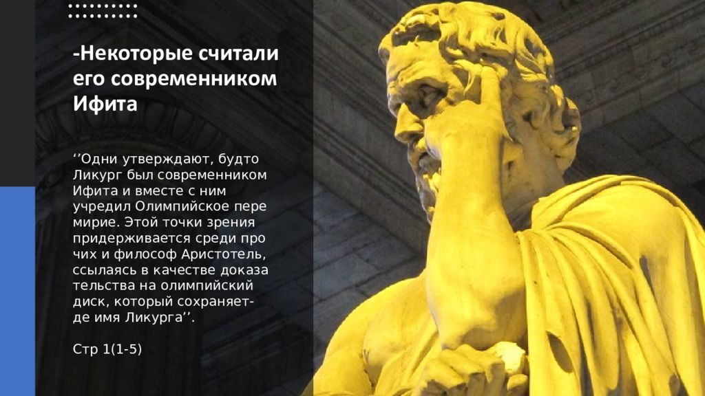 -Некоторые считали его современником Ифита ‘’ Одни утверждают, будто Ликург был современником Ифита и вместе с ним учредил Олимпийское перемирие. Этой точки зрения придерживается среди прочих и философ Аристотель, ссылаясь в качестве доказательства на олимпийский диск, который сохраняет-де имя Ликурга ’’. Стр 1 (1-5)