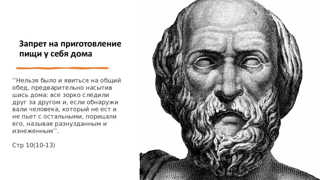 Запрет на приготовление пищи у себя дома ‘’ Нельзя было и явиться на общий обед, предварительно насытившись дома: все зорко следили друг за другом и, если обнаруживали человека, который не ест и не пьет с остальными, порицали его, называя разнузданным и изнеженным ’’. Стр 10 (10-13)