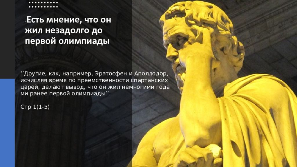 - Есть мнение, что он жил незадолго до первой олимпиады ‘’ Другие, как, например, Эратосфен и Аполлодор, исчисляя время по преемственности спартанских царей, делают вывод, что он жил немногими годами ранее первой олимпиады ’’. Стр 1 (1-5)