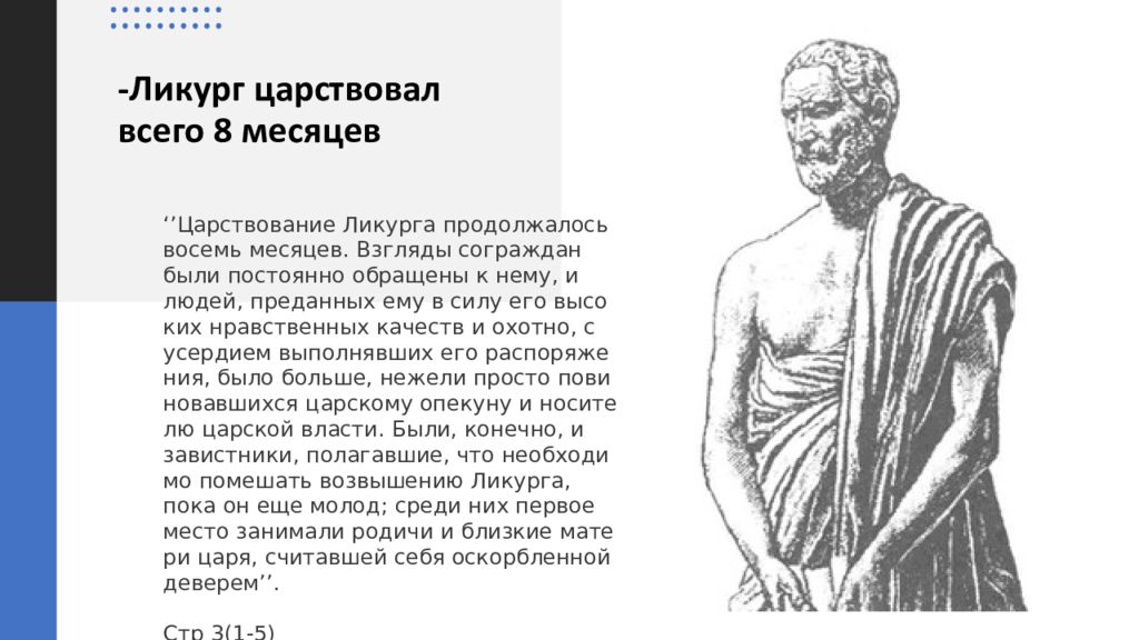 -Ликург царствовал всего 8 месяцев ‘’ Царствование Ликурга продолжалось восемь месяцев. Взгляды сограждан были постоянно обращены к нему, и людей, преданных ему в силу его высоких нравственных качеств и охотно, с усердием выполнявших его распоряжения, было больше, нежели просто повиновавшихся царскому опекуну и носителю царской власти. Были, конечно, и завистники, полагавшие, что необходимо помешать возвышению Ликурга, пока он еще молод; среди них первое место занимали родичи и близкие матери царя, считавшей себя оскорбленной деверем ’’. Стр 3 (1-5)