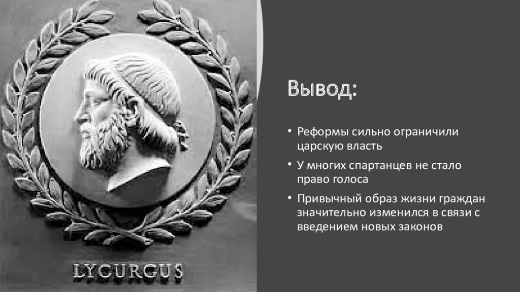 Реформы сильно ограничили царскую власть У многих спартанцев не стало право голоса Привычный образ жизни граждан значительно изменился в связи с введением новых законов